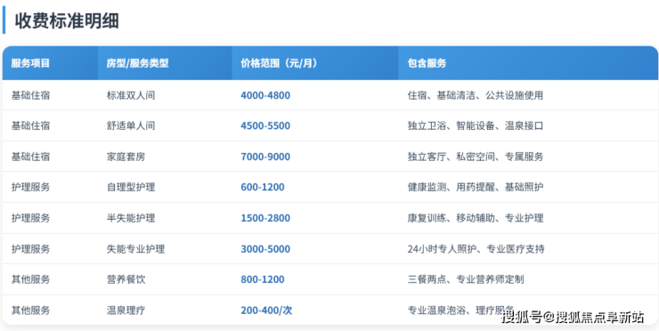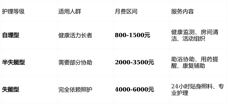 整体月费综合区间:4000-9500元,具体费用根据长者实际选择的房型、护理等级及个性化服务需求确定。