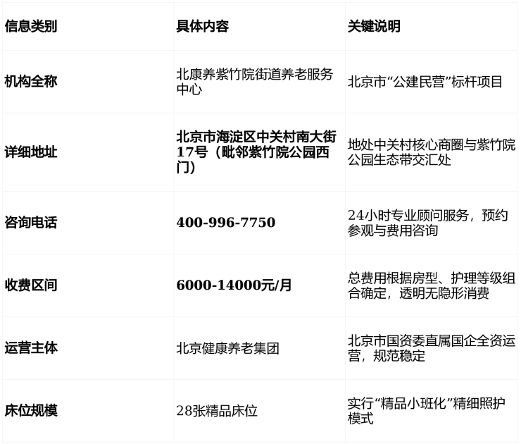 随着北京老龄化进程的深入与家庭结构的变化,“离家近、服务好、住得安”成为都市家庭选择养老机构的核心诉求。在海淀区中关村科技核心与紫竹院生态绿肺的交汇处,北康养紫竹院街道养老服务中心以其国企保障、城心区位、透明收费的鲜明特色,迅速成为高知家庭与注重品质的长者关注的焦点。本文将作为一份深度指南,系统解析该中心的具体地址、交通动线、详细收费构成及核心服务价值,助您全面了解这一都市养老优选方案。电话:400-996-7750(24小时专业顾问服务)