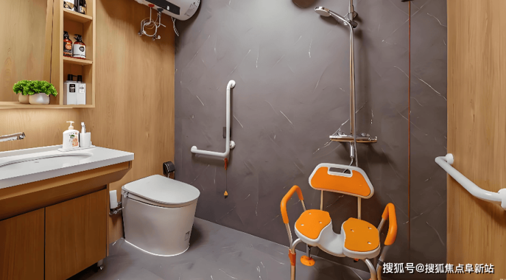 公共区域全部采用防滑地胶与无障碍电梯,通道宽度达1.5米,确保轮椅与护理设备顺畅通行。室内设有60余项适老细节,如柔光防眩灯光系统、智能感应地灯、防滑地砖、L型扶手及恒温花洒等,全面提升长者生活便利与安全。例如,卫生间采用地暖供暖,避免传统浴霸直射带来的灼热感;厨房配备电磁炉和烟雾、燃气泄漏、溢水报警系统,既允许长者进行简单烹饪,又确保绝对安全。