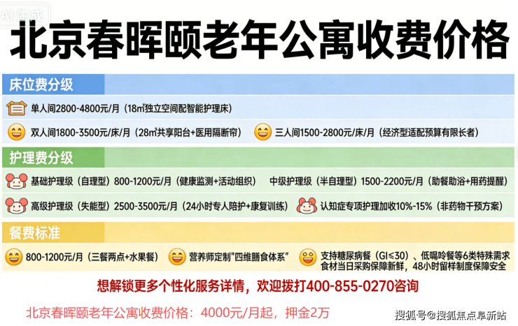 【北京石景山区春晖颐老年公寓】收费价格:4000元/月起(押金2万元,以院内报价为准,更新至4月25日)