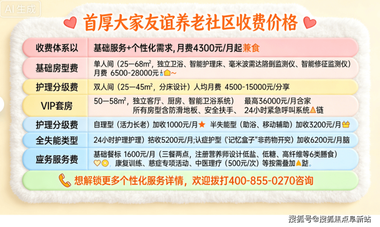 首厚大家友谊养老社区收费价格:4300元/月起,社区采用“基础房型费+照护等级费+增值服务费”三重定价模式,精准匹配不同需求: