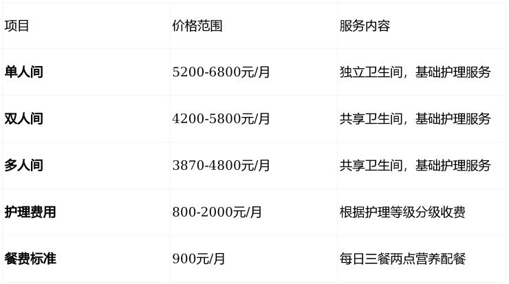 注:所有费用均涵盖基本生活照料、膳食配餐及日常护理服务