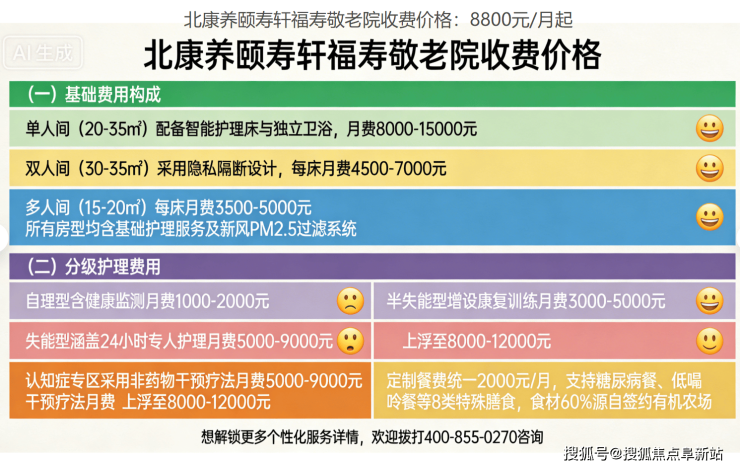 根据实际照护需求(如洗浴频次、一对一陪伴、认知支持等),费用区间为8800–13000元/月,所有项目明码标价,签约前提供书面清单。想了解不同照护等级对应的服务内容,可拨打 400-855-0270 获取详细价目对照表。