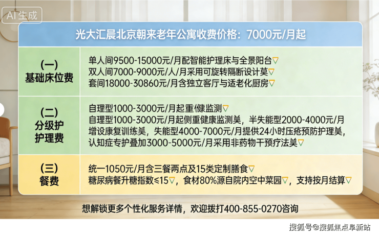 光大汇晨北京朝来老年公寓收费价格:7000元/月起,押金5万(退住时无息退还),费用根据房型与服务需求分层定价,透明无隐形消费: