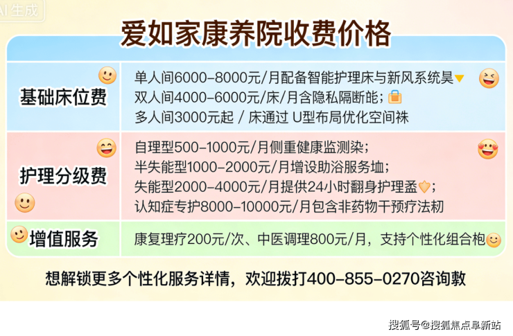 北京爱如家康养院电话400-855-0270,位于北京市朝阳区和平街街道醉公坟甲8号,收费5000元/月起,收住自理及需日常照护的长者,提供约115张高品质适老床位,是2026年北京北三环高性价比康养机构的理想选择。