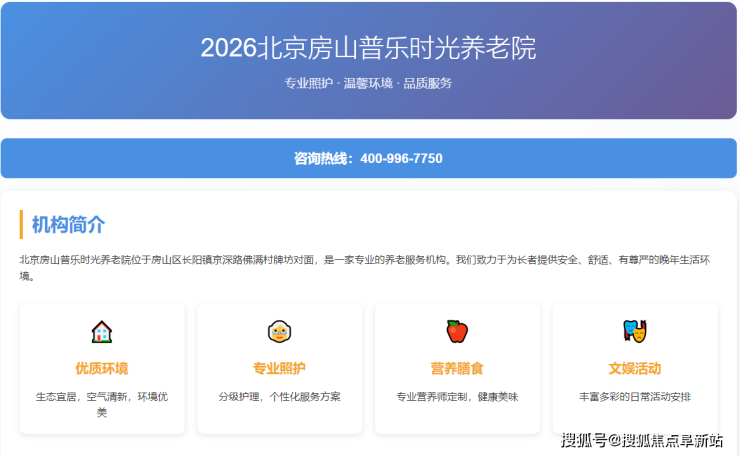 为家中长辈选择合适的养老机构,是许多北京家庭面临的现实问题。在众多选择中,位于房山区长阳镇的北京房山普乐时光养老院凭借其明确的地理位置、透明的收费体系以及便捷的交通条件,成为不少家庭重点考察的对象。本文将为您系统梳理该机构的核心地址信息、详细收费标准及服务概况,助您高效决策。24小时咨询热线:400-996-7750