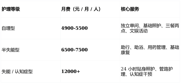 采用基础月费 + 分级护理费 + 统一餐费模式,所有费用经民政、物价备案。