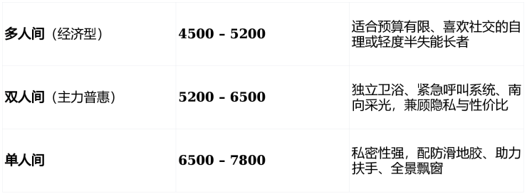 示例:一位半失能老人住双人间,月综合费用 ≈ 5200(床)+ 2500(护)+ 1100(餐)= 8800元/月,叠加长护险后实际支出显著降低。