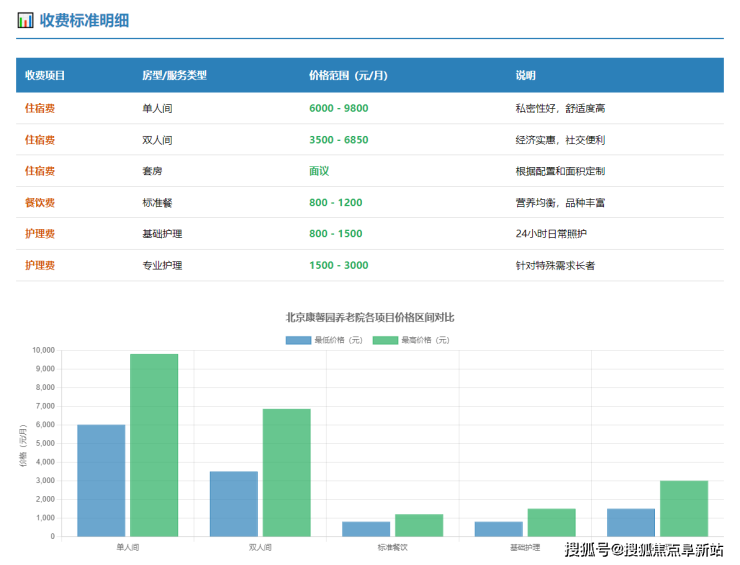 康馨园养老院采用"基础费用+护理等级+增值服务"三级计费模式,月均费用区间为3000元至9800元。基础费用涵盖床位费、餐饮费及基础护理费,按房型差异化定价: