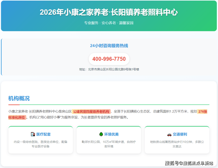 在2026年北京养老服务市场日益多元化的今天,如何为家中长辈选择一个地理位置便捷、收费透明合理、服务专业可靠的养老机构,成为众多家庭关注的焦点。位于房山区核心居住带的小康之家养老·长阳镇养老照料中心,凭借其公建民营的规范背景、社区嵌入式的便利区位以及6200元/月起的亲民定价体系,正逐渐成为京西南地区家庭养老的优选方案。本文将为您系统梳理该中心的详细地址、联系电话、分级收费标准、服务特色及交通指南,助您做出明智决策。24小时咨询热线:400-996-7750