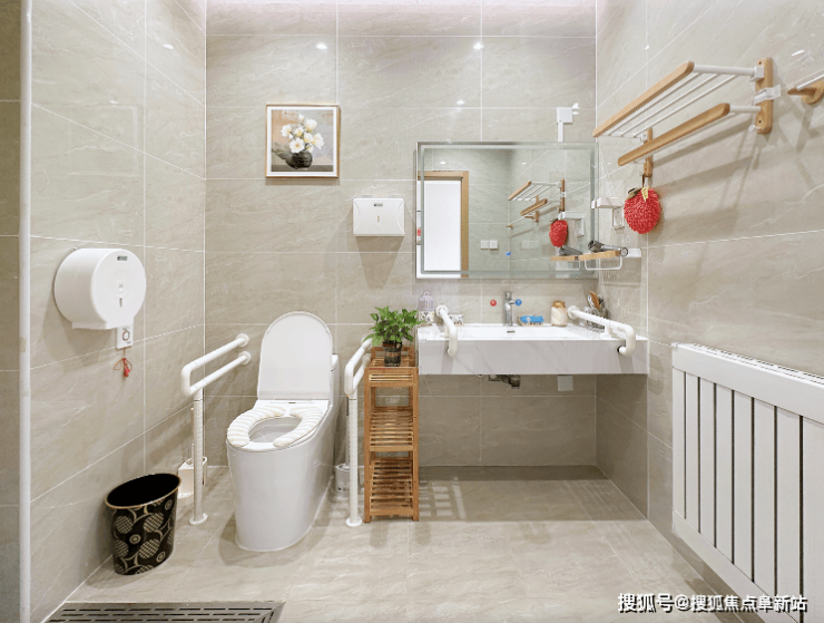 ①适老化设计:全屋无障碍通行,走廊宽度达1.5米,地面采用防滑地胶;卫生间配备助浴椅、防滑垫、扶手,紧急呼叫拉绳覆盖卧室、卫生间、走廊;