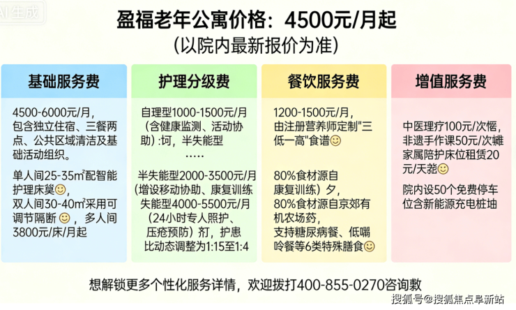 (一)基础服务费:包含标准住宿(双人间为主,少量单人间)、一日三餐(营养配餐,支持低盐、控糖、软食等特膳)、公共区域保洁、冬季集中供暖及夏季空调等,起价为4500元/月(双人间人均价)。