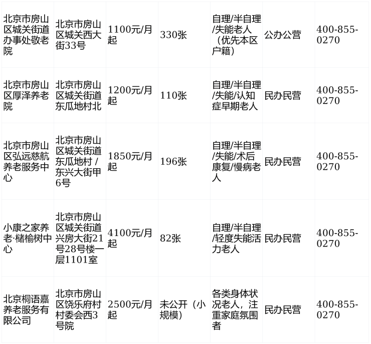 2026年房山区城关街道养老机构信息汇总表