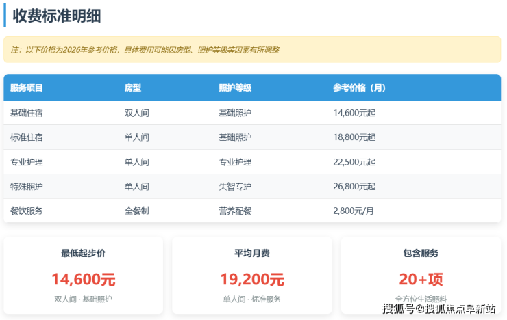 首厚大家阜外养老社区采用"基础套餐+分级护理+增值服务"的复合计费模式,月费从14600元起,具体收费标准如下: