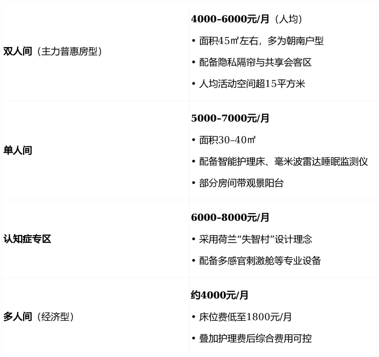 普惠多元适配:4000–8000元/月,560张床位规模化运营,多重优惠+医保报销,兼顾普惠与品质;