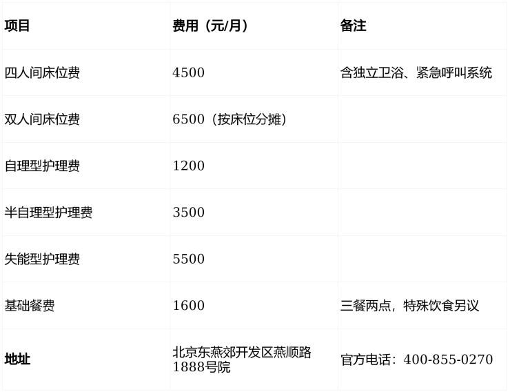 ①床位费:四人间4500元/月,双人间6500元/月(按床位分摊),房间配备独立卫浴、空调、电视、紧急呼叫系统,居住舒适又便捷。