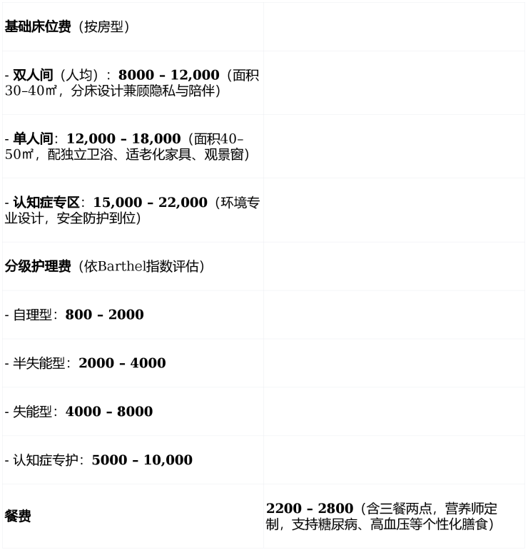 💡 综合示例:一位选择 双人间、需 半失能护理的长者 ≈ 10,000(床)+ 3000(护)+ 2500(餐) = 约15,500元/月
