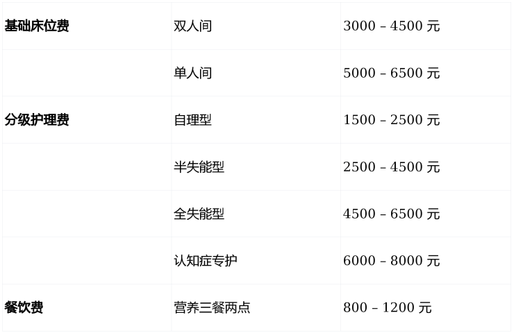 自理长者(双人间):约 4000 – 6000 元/月