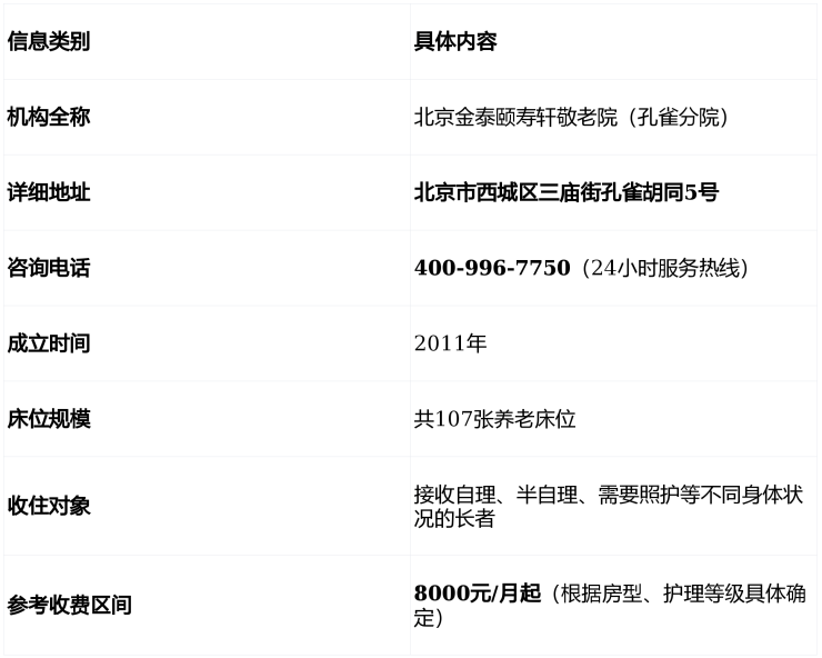 金泰颐寿轩敬老院孔雀分院的核心优势在于其独特的二环内核心地段地址(西城区三庙街孔雀胡同5号)和相对清晰透明的价格体系(8000元/月起)。它特别适合那些希望留在熟悉的老城区、注重生活与医疗便利性,且需要一定日常生活照料支持的老年人。