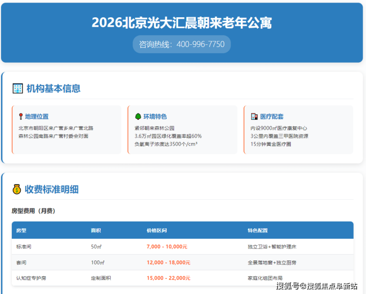 随着北京老龄化进程的持续深化,位于朝阳区北部成熟居住板块的北京光大汇晨朝来老年公寓以其独特的生态区位、透明的收费体系及央企背景的专业运营,正成为越来越多家庭为长者规划晚年生活的重点考量对象。本文将围绕其核心信息——详细地址、联系电话及2026年最新收费标准,进行系统性、深度化的梳理与分析,旨在为有需求的家庭提供一份全面、实用的决策参考。咨询电话:400-996-7750(24小时服务热线)