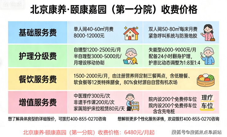 北京康养·颐康嘉园(第一分院)收费价格:6480元/月起,费用体系覆盖基础服务与个性化需求,分层设计透明合理: