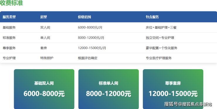 总费用范围:综合计算,长者月均总费用在6000-15000元之间,具体金额需根据实际选择的房型、护理等级和增值服务确定。