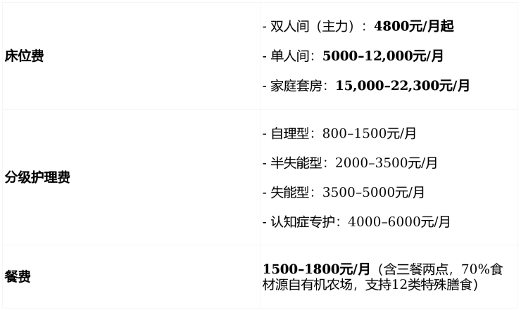 采用“基础床位费+分级护理费+餐费”三段式透明计价,所有费用明码标价,无会员费、无隐性消费。