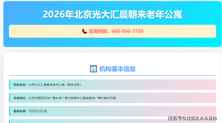 如果您正在为长辈寻找一处靠谱的养老机构,北京光大汇晨朝来老年公寓值得您的深入了解。欢迎拨打400-996-7750咨询详情或预约实地考察,让专业团队为您提供个性化的养老解决方案。