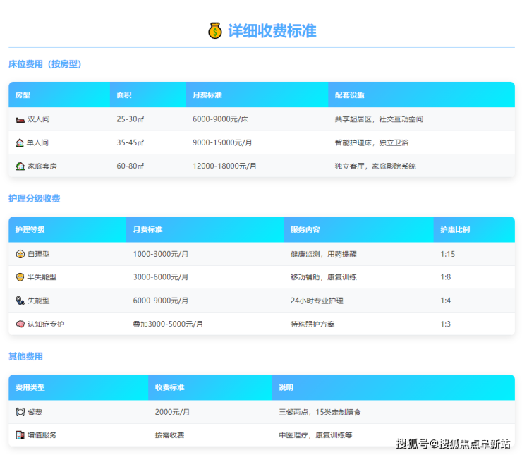 采用"床位费+护理费+餐费"的三维定价模式,所有费用透明公示: