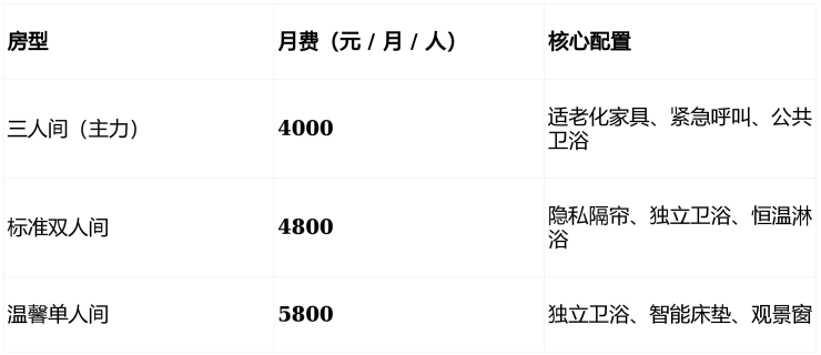 采用基础床位费 + 分级护理费 + 餐费三维透明模式,费用经民政、物价双重备案。