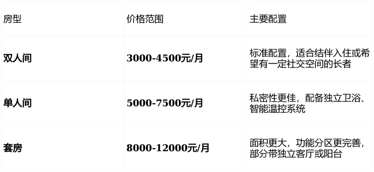 举例说明:一位选择单人间的半失能长者,月度总费用约为5000元(房型)+ 2000元(护理)+ 1200元(膳食)≈ 8200元/月。最终价格需经公寓专业评估团队对长者进行综合能力评估后确定。