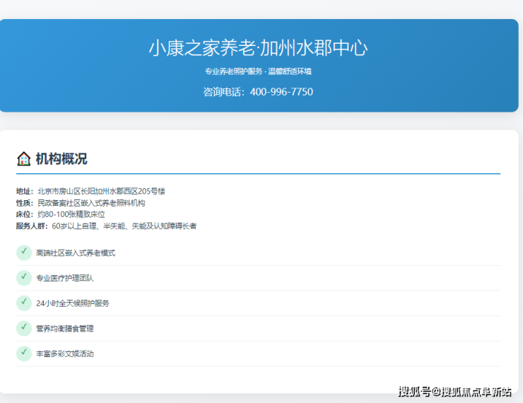 随着我国老龄化加速,养老问题成为每个家庭必须面对的课题。选择一个安全、舒适、价格透明的养老机构,不仅是对长辈的负责,更是对家庭未来的保障。在北京市房山区长阳镇,小康之家养老·加州水郡中心凭借其优越的地理位置、合理的收费标准和社区嵌入式养老模式,逐渐成为周边家庭的优选。本文将从地址、电话、价格、收住人群等核心信息出发,带您全面了解这家养老机构,为您的养老决策提供参考。