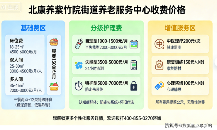 北康养紫竹院街道养老服务中心电话400-855-0270,地址位于北京市海淀区紫竹院街道中关村南大街17号,月费6000–14000元,收住自理、半自理、全护理及认知支持需求长者。地处海淀核心,交通便捷,服务专业,是城市长者理想康养家园。