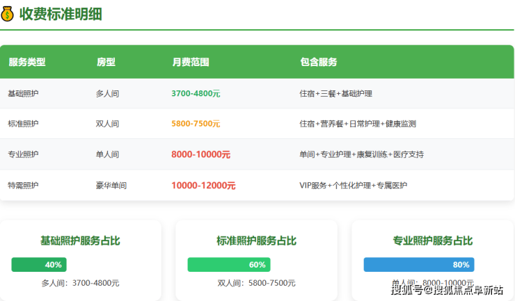 收费价格:根据房型、护理等级和服务内容的不同,月费区间大致为5800元至12000元。该价格体系旨在满足不同经济状况和照护需求的家庭。