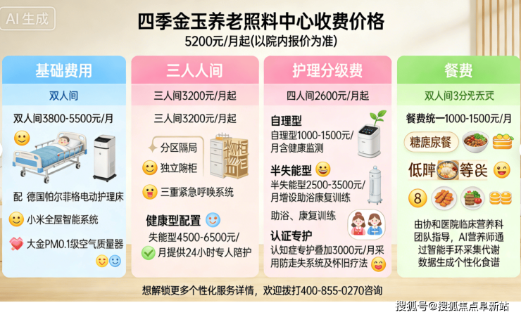 电话:400-855-0270 |地址:北京市海淀区田村山南路35号院7号楼 |价格:5200元/月起 |收住人群:自理、半自理、失能长者作为海淀区优质养老机构,四季金玉以小规模、精细化的服务模式,为长者提供安全、舒适、有尊严的晚年生活。如果您正在为长辈寻找一家医养结合、性价比高的养老院,不妨拨打400-855-0270,预约一次实地探访,亲眼见证这里的温暖与专业!
