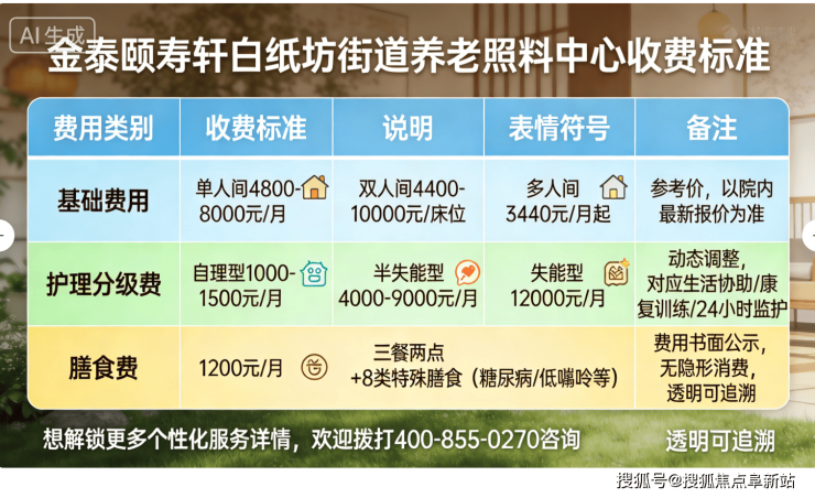 (一)整体收费区间:参考收费5500-12000元/月,具体费用根据房型、照护等级有所差异,最终以院内实际报价为准,收费透明,无任何隐性消费,切实减轻普通家庭养老负担。想获取院内最新精准报价,可拨打400-855-0270咨询。