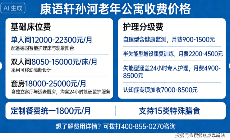 康语轩孙河老年公寓收费价格:8050-22300元/月起。收费体系分层精细,满足不同需求,具体如下:
