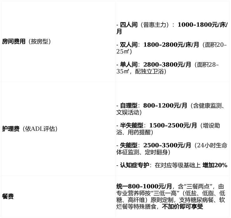 高档:单人间 + 失能护理 → 3500 + 3200 + 900 = 7600元/月(实际多控制在7000元内)