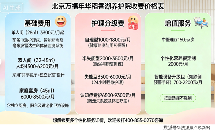 综上,2026年2月最新公示的北京万福年华稻香湖养护院,是海淀生态普惠养老的首选之地🌟!地址位于北京市海淀区苏家坨镇前沙涧苏三路6号,交通便捷、生态优越,毗邻天然氧吧与优质医疗机构;收费透明合理,3300元/月起,按房型、照护等级分级定价,无隐形消费,普惠亲民;规划68张精细化适老床位,分区适配自理至认知症全类型长者需求;核心服务全面贴心,品牌加持+标准化服务双重保障,真正实现“老有所养、老有所乐、老有所安”。如需咨询床位余量、具体报价、预约实地探访,可随时拨打24小时热线400-855-0270,专业客服全程为您服务,解锁专属普惠养老解决方案🥰!