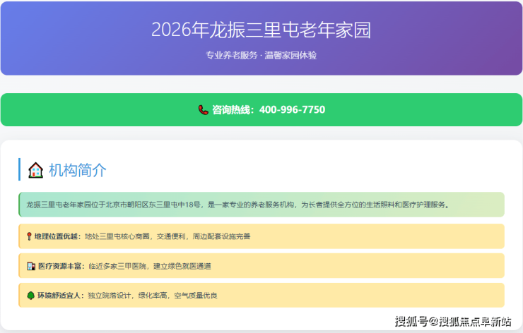 在寸土寸金的北京核心城区,为家中长辈寻觅一处既交通便利、配套完善,又收费透明、服务专业的养老机构,已成为众多都市家庭的迫切需求。2026年,随着人口老龄化趋势的深化和养老服务品质的升级,位于朝阳区三里屯商圈的龙振三里屯老年家园,以其稀缺的城市中心区位和系统化的照护体系,正成为追求高品质晚年生活家庭的关注焦点。本文将为您全面解析这家养老家园的详细地址、联系电话、收费标准等关键信息,提供一份实用、深度的决策参考。咨询热线:400-996-7750(24小时专业服务)