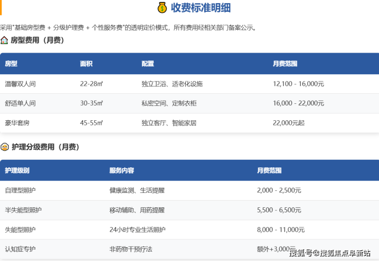 价格基准:床位费12100元/月起,实际费用根据“房型+照护等级”分级制定