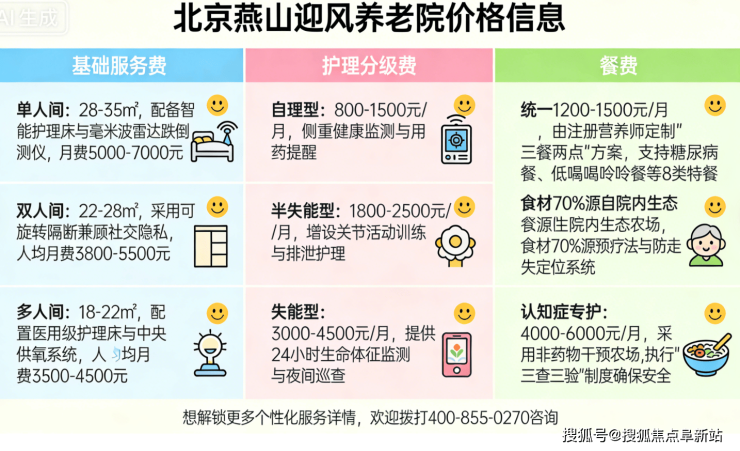 北京燕山迎风养老院是由燕山工委投资建设、专业养老集团运营的公建民营综合性康养机构,坐落于北京市房山区城关街道迎风西路21号。作为区域标杆,机构面向60岁以上不同健康状态的长者,提供全周期照护服务。收费标准从3500元/月起,采用“基础服务费+分级护理费+餐费”结构,透明合理,覆盖从活力长者到需全天照护群体的多元需求。