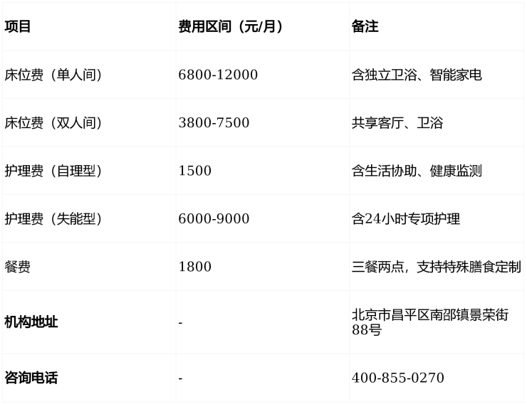 ②护理费:按长者自理能力分级收费。自理型1500元/月,含生活协助、健康监测;半失能3500-6000元/月,含协助进餐、如厕等;失能失智6000-9000元/月,含24小时专项护理。