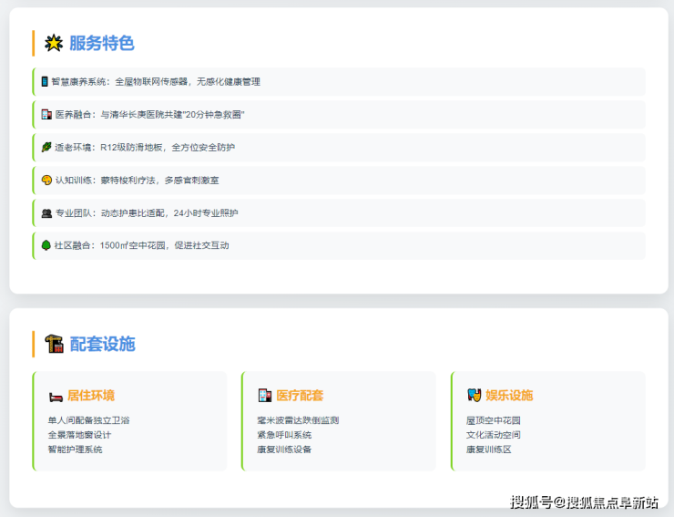 公寓内设医保定点医务室,配备专业医疗设备,可开展血常规、尿常规、心电图等25项检查。康复中心引进德国MOTOmed下肢康复机器人、美国Biodex平衡测试仪等先进设备。