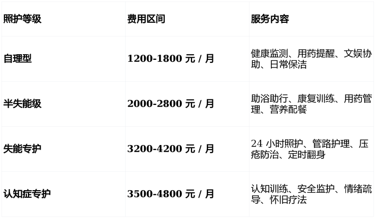 采用床位费 + 分级护理费 + 餐费组合,费用公开透明。