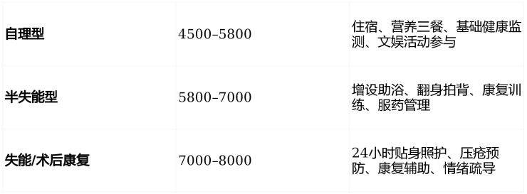 注:费用已包含 三餐两点、基础护理、健康管理、日常文娱及紧急响应服务。