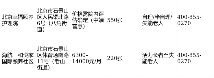 2026年石景山区养老机构信息汇总表