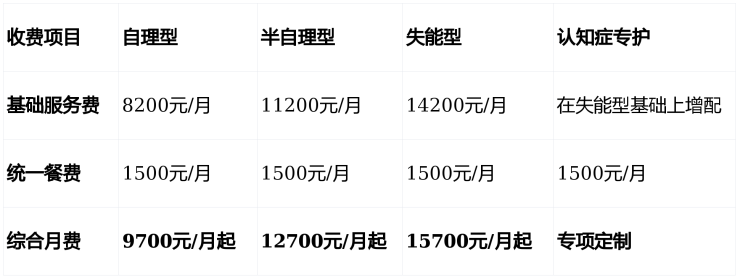 参考收费区间:9700元/月起(根据护理等级分级定价)