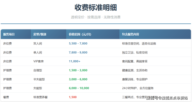 价格区间:5500-11000元/月。采用“床位费+护理费+餐费”的模块化透明计价模式,无任何隐性消费,适配不同预算与照护需求的家庭。