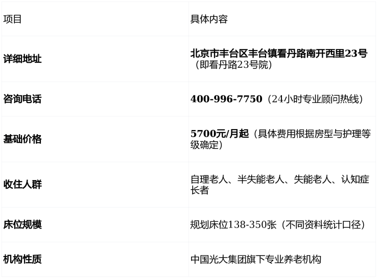 在深入了解具体细节前,我们先通过简表快速掌握光大汇晨北京科丰老年公寓的关键信息: